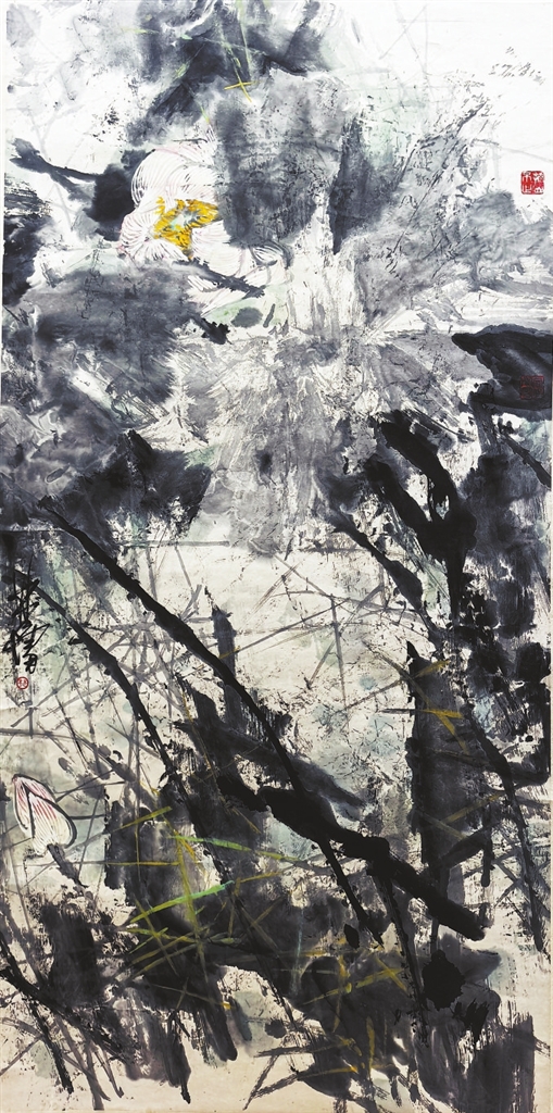 广东著名画家林墉画了一张四尺整纸的《荷》(下右一图),笔墨酣畅、风格潇洒,颇为精彩。其大写意绘画风格与八大山人一脉相通。