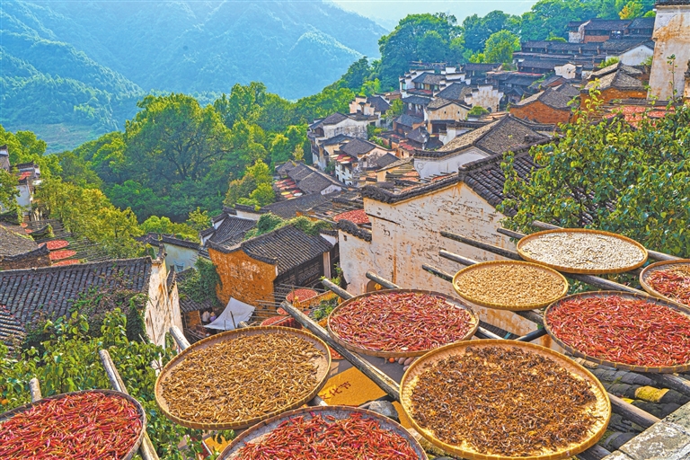“村民在房前屋后及自家窗台、屋顶,用竹篾盘架晒或挂晒着收获的农作物,这不仅是一种农俗,也是农民丰收喜悦的一种呈现。”婺源县秋口镇相关负责人介绍。
