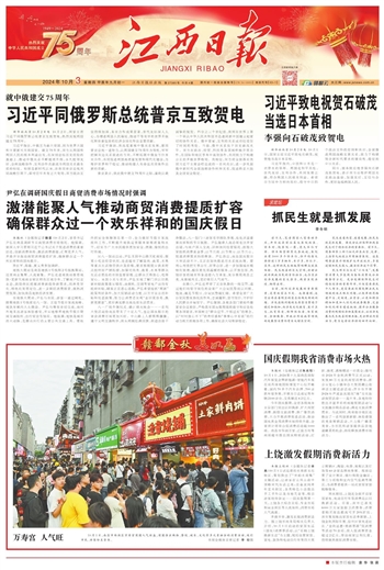 本报讯 (全媒体记者魏星)10月2日,省委书记尹弘在南昌调研节日商贸消费市场情况。他强调,要深入学习贯彻习近平总书记关于促进消费的重要论述,创新消费供给,激活消费潜能,汇聚更多人气,多措并举推动商贸消费提质扩容,确保群众过一个欢乐祥和的国庆假日。