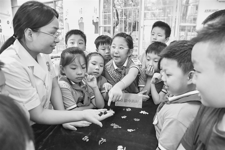 9月27日,南昌市第二中西医结合医院医务人员,在邮政路小学射步亭校区开展中医药科普知识进校园活动。孩子们通过现场触摸、闻香识药,感受中医药魅力。