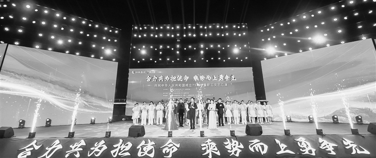 本次文艺汇演分为三个篇章,精彩纷呈的节目依次上演,为观众带来了一场视听盛宴。第一篇章为“赣江新象绽光芒、活力绽放谱华章”,活力四射的开场舞蹈《加油吧,少年》瞬间点燃了现场的气氛;声情并茂的诗朗诵《你好!赣江!》讲述新区发展变化;旋律轻快明朗的歌伴舞《小哥》和诙谐幽默的小品《误会了》为观众带来无尽欢乐。第二篇章是“礼赞祖国心飞扬、盛世中华韵悠长”,歌伴舞情景剧《人世间》带领观众走入充满情感的世界;乐队表演《我爱你中国》等三首风格各异的歌曲释放出无穷魅力;舞蹈《珊瑚颂》和红歌串烧《青春中国》传递出积极向上的拼搏力量。第三篇章是“合力共为志如钢、乘势而上创辉煌”,国乐表演《盛世国潮》展现了传统文化的底蕴和魅力;歌伴舞《我的梦》唱出奋斗者对梦想的执著追求;南大一附院赣江新区医院医护人员带来的《向光而行》,传递出“医者仁心”的坚定信念。在压轴戏中,赣江控股集团全体职工用大合唱《赣江之歌》,展示出了团结奋进、拼搏进取的精神面貌,铿锵激昂的歌声将晚会推向了高潮。(兰 伟/文 王 遇/图)