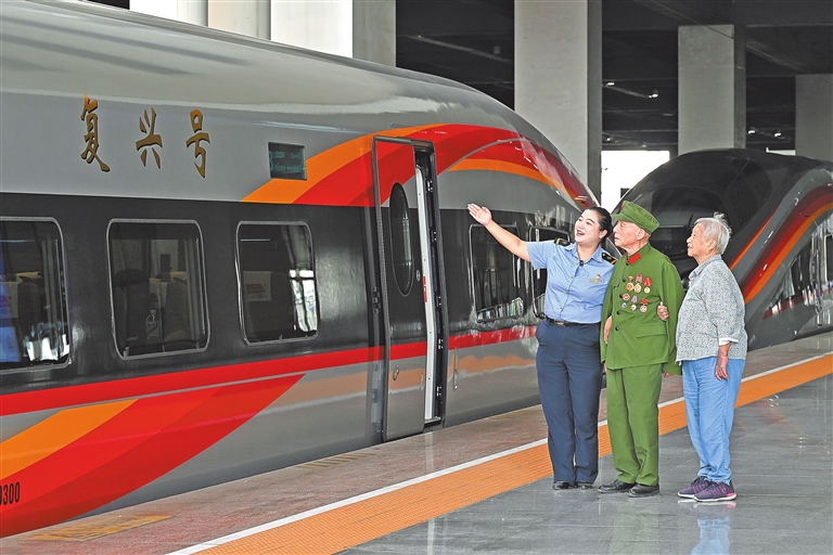 9月26日上午,南昌火车站东站房10号站台迎来了一位特殊的客人,看着复兴号列车从身边疾驰而过,老人的眼眶噙满激动的泪水。“舒老,这就是复兴号列车,时速350公里,全球速度最快!”南昌火车站客运值班员李军说。
