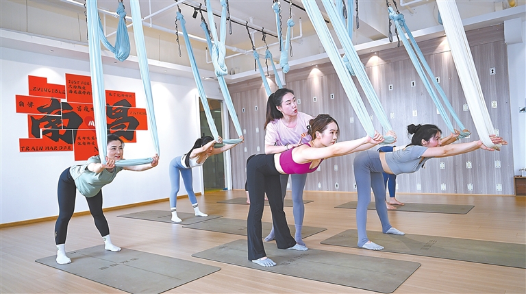 “延伸腋窝,放松双肩,呼气抬头,微笑看向前方。”9月25日,在南昌市西湖区M2女子运动中心,西湖区“最美退役军人”李莉正带领学员们练习空中瑜伽的动作技巧。
