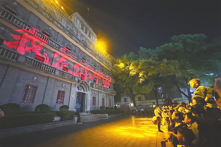 10月2日晚,“光影八一”灯光秀在南昌八一起义纪念馆上演,光影与建筑完美融合,演绎出震撼的视觉效果,吸引大批游客前来观看。