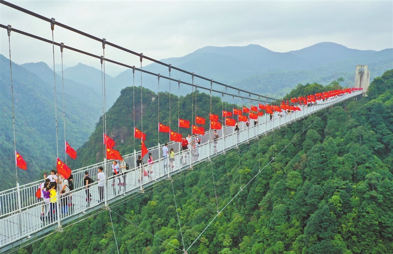 10月1日,安远县三百山景区玻璃天桥上,一面面五星红旗迎风飘扬,营造出浓浓的节日氛围。