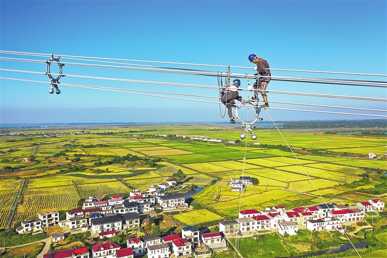 10月4日,永修县三角乡,电力工人正在武汉-南昌1000千伏特高压交流工程线路上安装设备。国庆期间,施工方组织人员坚守岗位赶进度,确保该项目本月下旬投入使用。本报全媒体记者 洪子波摄