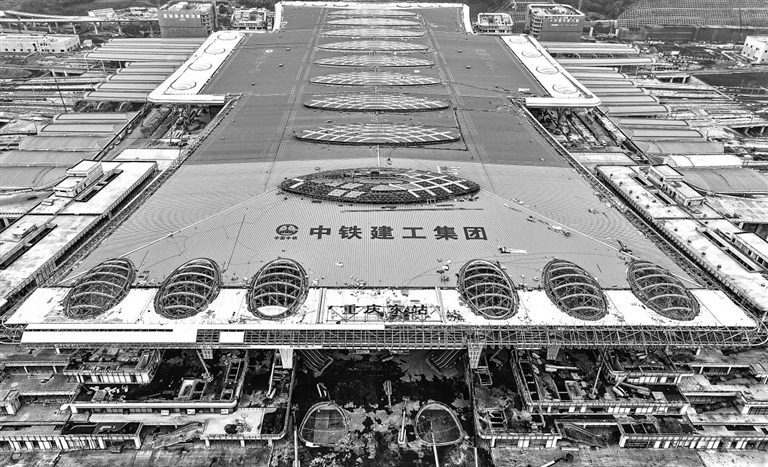 这是10月6日拍摄的建设中的重庆东站站房及配套综合交通枢纽工程(无人机照片)。重庆东站站房及配套综合交通枢纽工程是交通强国建设站城一体化试点工程,建成后将引入渝湘高铁、渝万高铁、渝贵高铁、渝昆高铁等多条线路,成为西部地区最大高铁枢纽站。 新华社记者 王全超摄