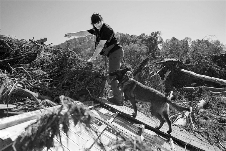 10月5日,在美国北卡罗来纳州伯恩斯维尔,一名女子和她的搜救犬在飓风过后的废墟中搜寻遇难者遗体。连日来,飓风“海伦妮”在美国东南部多州造成的死亡人数持续攀升。美国官员5日称,飓风已导致至少222人死亡。 新华社/法新