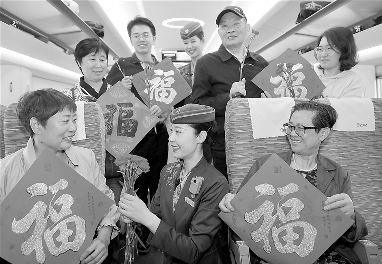 10月10日,在武汉开往大冶北D7007次列车上,武汉铁路工作人员给老年旅客赠送康乃馨鲜花。新华社发(赵 军摄)