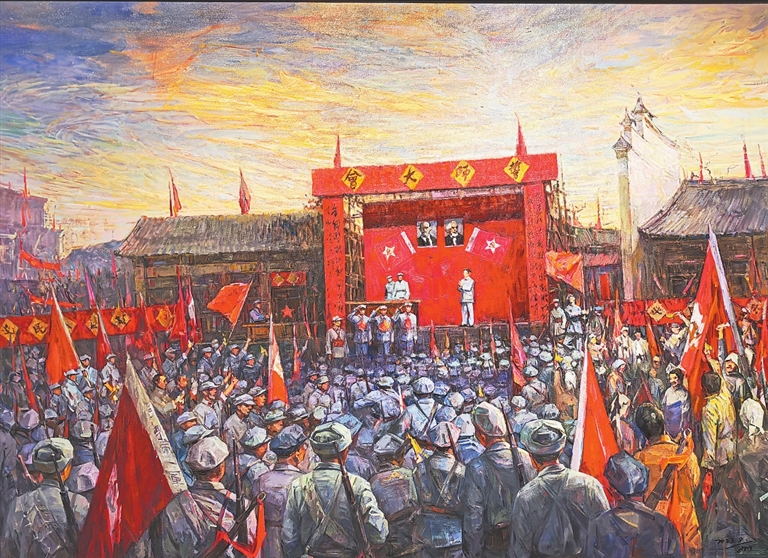 赣南是“共和国摇篮”、中央红军长征集结出发地,是红色革命题材美术创作的“富矿”。“中央美术学院支持赣南原中央苏区红色主题创作”项目于2021年立项,项目工程由中国美协主席、中央美术学院时任院长范迪安部署,国家主题性美术创作研究中心具体实施,组织中央美术学院30多位中青年骨干教师参与创作。3年来,作者们深入赣南实地采风,经过精心创作打磨出来的30多幅油画、国画作品,生动再现了当年在赣南原中央苏区发生的重要革命事件,讴歌了伟大的苏区精神、长征精神。据悉,这些作品加上特邀赣南本土画家创作的两幅主题油画作品,于10月14日展览结束后,将按预定题材分别收藏于赣州市博物馆、赣州美术馆、瑞金中央革命根据地纪念馆、于都中央红军长征出发纪念馆、毛泽东寻乌调查纪念馆。