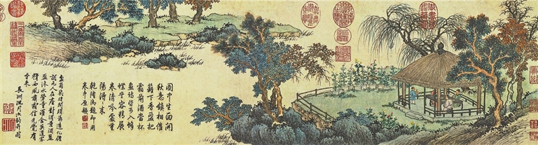 沈周(1427—1509),字启南,号石田,晚号白石翁,明代绘画大师、书法家,江苏苏州人。沈周的绘画弘扬了文人画的传统,将诗书画进一步结合起来。早年多作小幅,40岁以后始作大幅;中年画法严谨细秀,用笔沉着劲练,以骨力胜;晚岁笔墨浑厚,线条老辣,意境深远。《盆菊幽赏图》,纸本设色,纵23.4厘米,横86厘米,画面中杂树数株,枝叶茂盛,垂柳摇曳,有的树叶已经变成黄红色,表现的是金秋时节,秋高气爽。茂树掩映一座草亭,四周以栅栏隔成庭院,院里置若干盆菊花,盛开怒放,争奇斗艳。亭内三位雅士围坐在一张桌子前,饮酒赏菊,意态悠闲,一童子持壶侍立。草亭周围块块岩石分布得体,庭院中小草点缀其间盎然生趣。对岸沙洲芳草萋萋,林木葱郁,景致优美。
