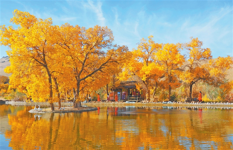 10月14日,游客在甘肃省阿克塞哈萨克族自治县胡杨峡景区游玩。
