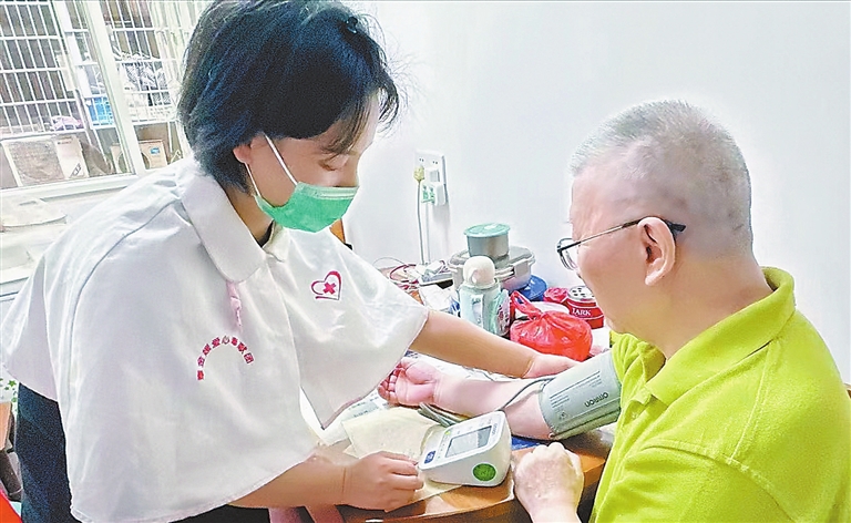 邹福秀对记者说:“这个小姑娘每周都来看我,给我量血压,陪我聊天,对老人很好。”