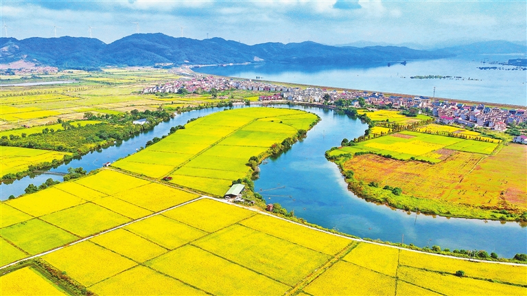 10月17日,在吉水县盘谷镇菜园村,水稻丰收在望,金黄稻田与绿水青山相互映衬,田园风景美如油画。