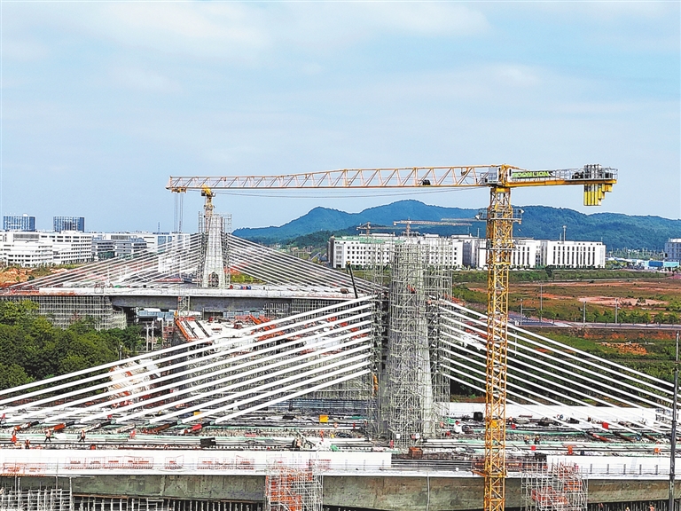| 10月20日,在赣江新区新祺周片区阳光大道跨京九铁路和昌九城际铁路转体斜拉桥项目建设现场,工人们抢抓晴好天气,紧张有序地进行施工作业,全力推进项目建设进度。通讯员 袁 骏摄 |