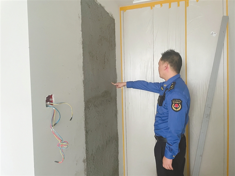 “705室本来就是两层的复式楼,搭建一层后变成三层,他们又运砖上去搭建电梯井,准备安装家用电梯。”谭大姐告诉记者,自从电梯井建起来后,她家卧室与客厅就相继出现一米多长的裂缝,位置就在楼顶的电梯井附近。“我开始还以为是刮瓷开裂,找来师傅修补,师傅说这是墙内产生的裂缝,刮瓷修补没用。我怀疑是楼顶搭建造成的负荷过大,整栋楼产生了安全问题。楼下的居民对此都非常担心,但我们向城管部门投诉后,却一直没有结果。”