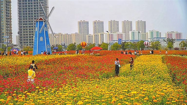 10月29日,南昌市新建区马兰圩湿地公园里色彩斑斓,荷兰风车、热气球等景观雕塑与花海融合,让人仿佛走进了油画般的莫奈花园。本报全媒体记者 蔡铖歌摄