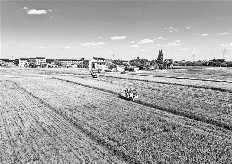 11月6日,农机手驾驶收割机在江苏省泰州医药高新区(高港区)口岸街道徐庄村收割水稻(无人机照片)。