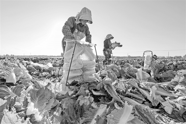 11月6日,河北省唐山市丰南区王兰庄镇一家蔬菜种植合作社的社员在田间收获大白菜。