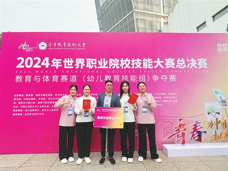 10月25日至28日,2024年世界职业院校技能大赛总决赛教育与体育赛道(幼儿教育技能组)争夺赛在金华职业技术大学举行,来自全国各地61支职业院校代表队齐聚一堂,共同竞技。经过激烈角逐,赣西科技职业学院教育学院金珍萍、徐道惟团队(指导教师:李方园、夏梦情)不畏强手奋力拼搏,表现出色斩获银奖,充分展现该校师生的专业素养和教学实力。
