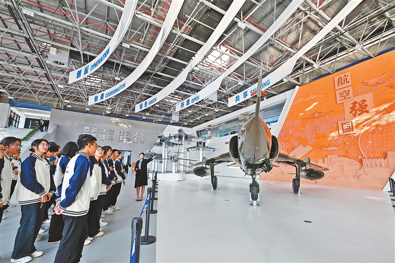 11月2日,南昌航空大学航空科技馆内,讲解员正在为学生进行航空科普。当日,该校航空科技馆开馆,馆内集中展示了军用和民用航空器的实体、模型,让学生沉浸式感受航空科技魅力。