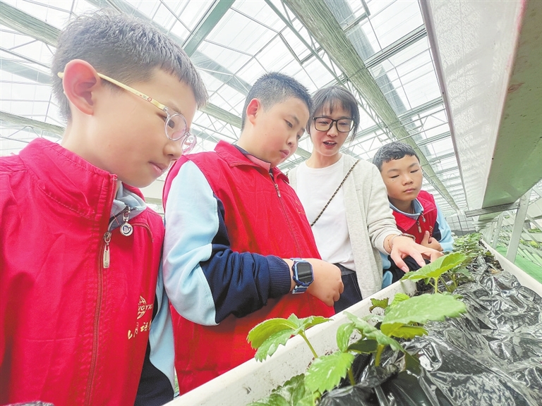 日前,在九江市柴桑区城门街道白合村的白合生态产业园玻璃温室大棚内,学生们正在察看盆栽草莓苗长势。