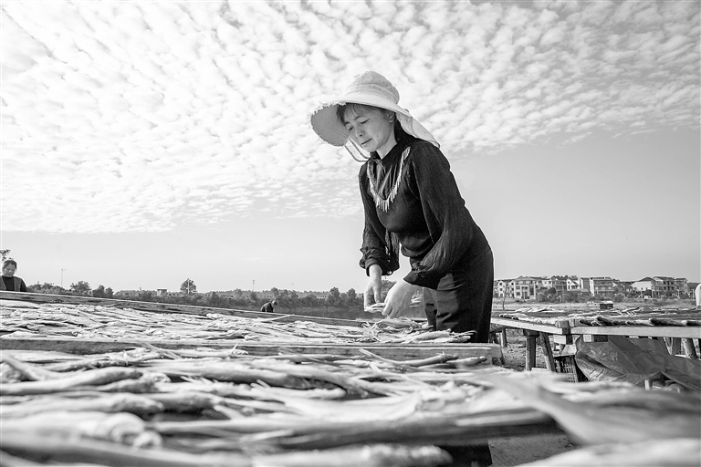 11月12日,都昌县芗溪乡井头村村民在晾晒鱼干。初冬时节,井头村村民忙着将收购来的淡水鱼进行腌制、晾晒,加工成鱼干,通过线上线下的渠道销往全国各地,促进增收。