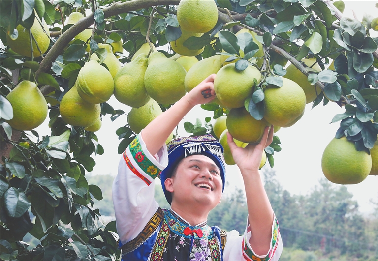 11月13日,在赣州市南康区赤土畲族乡万亩甜柚基地,游客身着畲族传统服装体验采摘乐趣,享受丰收的喜悦。南康区今年甜柚种植面积为2.06万亩,产量预计超4万吨。