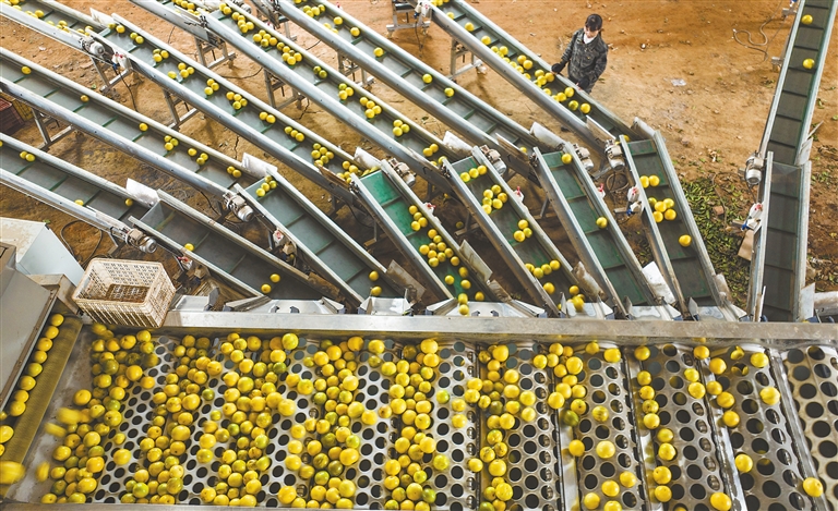 | ▲11月19日,员工在新干县沂江乡黄土堎胡柚基地仓库内分拣胡柚。新干县沂江乡黄土堎胡柚基地通过招商引资方式,将原本荒弃的老果园进行胡柚品种改良,并运用智能水肥一体化等新技术和“公司+基地+农户”的模式对果园精心管理,带动周边农户增收致富。特约通讯员 李福孙摄 |