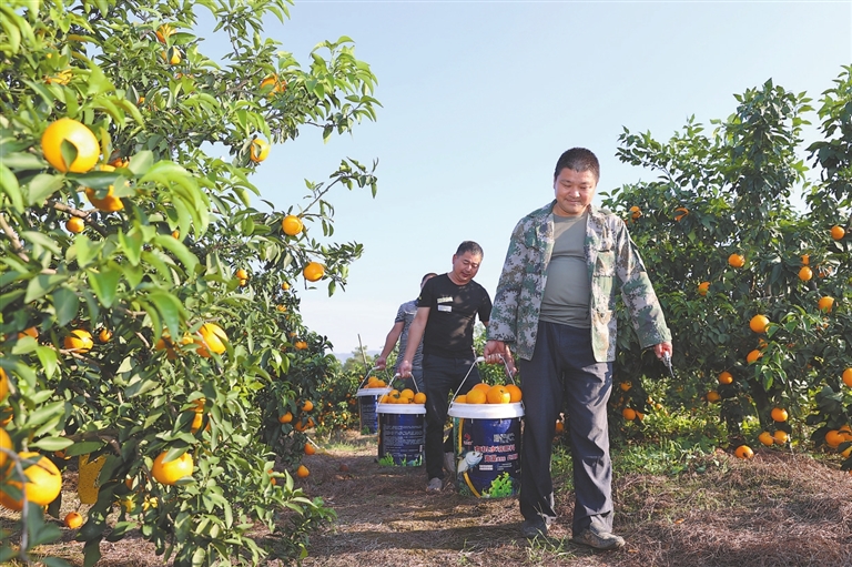 | ◀近日,万安县枧头镇下潞村300多亩果冻橙基地迎来丰收期,果农在果林中收获满满。近年来,万安县围绕“农业增效、农民增收”的发展目标,充分发挥当地富硒土壤资源优势,持续加大新品种的引进和新技术的推广应用,大力发展富硒生态果业产业,带动农户增收致富。本报全媒体记者 吴福清摄 |