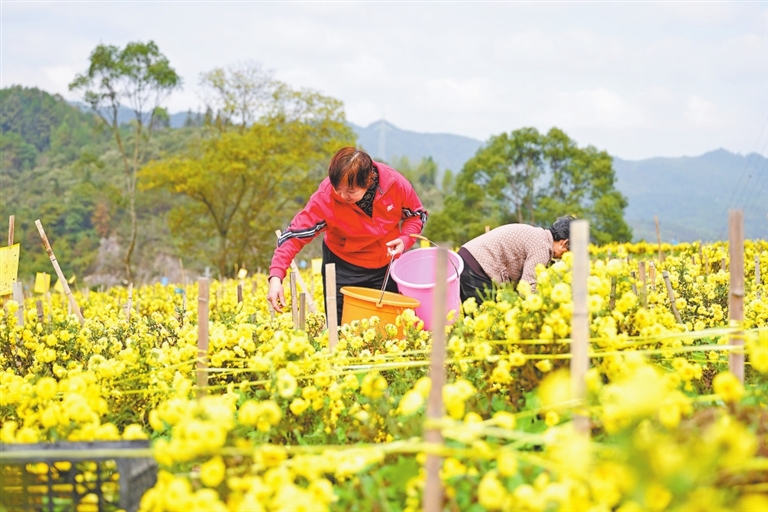 11月19日,宜春市明月山温泉风景名胜区温汤镇彭坊村,千亩富硒皇菊盛开,村民正忙着采摘。近年来,该镇依托得天独厚的富硒土壤资源,大力推进富硒菊花、富硒大米等产业发展,促进农民增收,助力乡村振兴。本报全媒体记者 洪子波摄