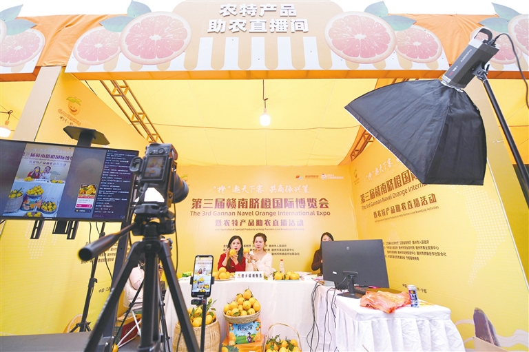 11月23日,为了加大脐橙宣传推介和销售力度,在第三届赣南脐橙国际博览会农特产品助农活动现场,当地通过举办助农直播活动,开展线上销售,当天销售额突破100万元。图为主播带货现场。曾嵘峰摄