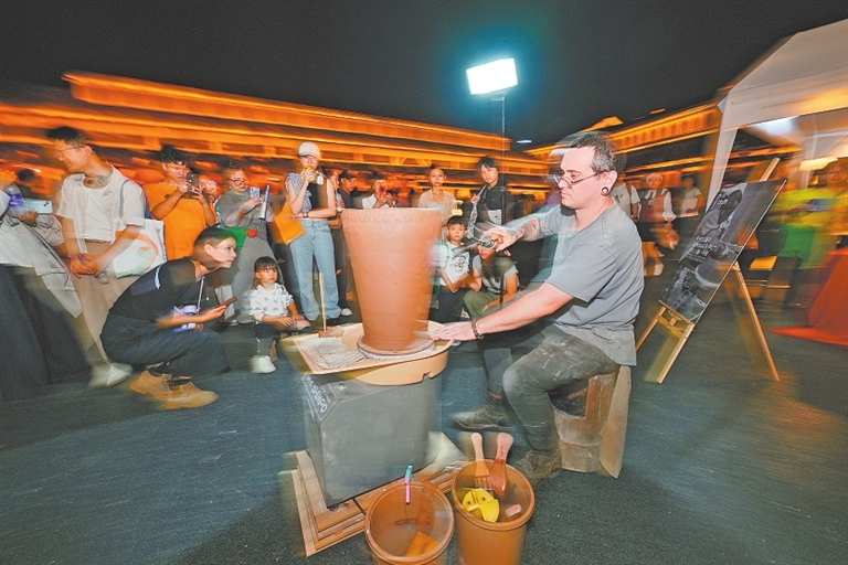 陶溪川文创街区是国家级夜间文旅消费集聚区——景德镇“夜珠山”消费带的重要一环,每当夜幕低垂,暖色调的灯光便将陶溪川点亮。在这里,不仅有周末的陶瓷夜市,还有令人期待的一年两次的“春秋大集”。“景德镇的夜市真的很棒,我可以体验到不同的文化,还能结识志趣相投的朋友。”来自匈牙利的陶瓷艺术工作者凯蒂感叹并大声表白——“我爱景德镇”。10月,在“春秋大集(秋集)”这一场以秋天为名的集市里,来自全球55个国家的500余名国际艺术工作者和800多名国内手艺人汇聚于此,中国文化与世界艺术的“双向奔赴”在这一刻被具象化。
