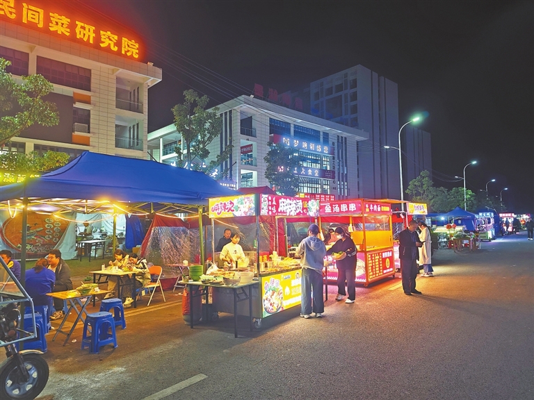 夜幕降临,赣州经开区创业南路的美食摊点开始营业。各色小吃热气蒸腾,散发着诱人的香味,吸引行人驻足。