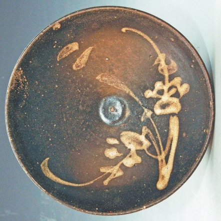 古人喜爱梅花,宋代文人尤爱梅花之傲骨,如王安石有“墙角数枝梅,凌寒独自开”句,林和靖有诗“疏影横斜水清浅,暗香浮动月黄昏”。梅花凌霜傲骨、高洁脱俗的品格和月影浪漫的意境使得“月影梅”成为艺术创作的重要题材。“月影梅”纹饰也称“月梅纹”或“梅梢月”,描绘的画面为梅花枝头挂一轮明月。“月影梅”纹饰的技法使用了釉下彩绘工艺,盏中的“月影梅”一般为黄褐彩,其画风较为抽象,构图简单。纹饰整体元素较少,位置一般位于盏心周围,也有的在盏壁上描。“月影梅”纹饰是吉州窑黑釉盏纹饰中数量较多的类型。“月影梅”纹如同投影般展现在茶盏中,在不同光线下,颜色有着或深或浅的变化。当水注入茶盏时,纹饰如同水中倒影随水而动,具有动态之美。这种动态的视觉效果给人饮茶过程带来美的享受。