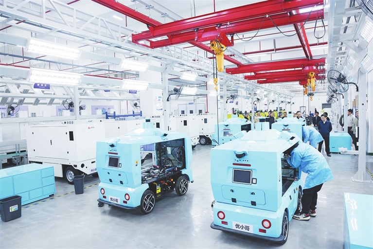 位于九江市濂溪区的优地机器人智能制造基地内,工作人员正在生产“优小哥”“优小妹”等物流服务机器人。