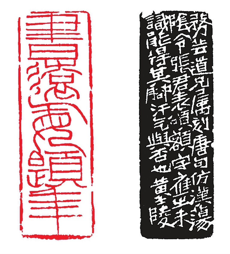 “书远每题年”印(上图),是黄士陵的重要代表作。该印边款“务耘道兄属刻唐句,仿汉荡阴令张君表颂额字应之,未识能得其脚汗气与否也,黄士陵”,“务耘”,为黄士陵挚友欧阳耘;“荡阴令张君表颂”,即汉隶《张迁碑》碑额篆书。印文“书远每题年”句,出自唐代诗人李约《从军行》“路长唯算月,书远每题年”,意为:从军离家遥远,寄一封家书要以月计算,所以要注明写信的年份,以免家人产生误会。此语表达了作者内心的乡愁。