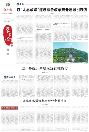 党的二十届三中全会提出,“优化文化服务和文化产品供给机制”,为提升公共文化服务水平,让人民享有更加充实、更为丰富、更高质量的精神文化生活提供了科学指引。在我省今年召开的文化强省建设推进大会上,省委提出,“深入践行以人民为中心的发展思想,优化公共文化服务供给,创新实施文化惠民工程,加强文艺精品创作,打造一批彰显江西特色、展现江西气派的优秀文艺作品”。更好满足人民文化需求、增强人民精神力量,要以提升公共文化服务水平推进精神生活共同富裕,充分发挥政策引导和支持作用,激发文化发展的内生动力,不断建立健全公共文化服务体系、推动文化产品创新供给,让文化服务更加优质高效,文化产品更加丰富多样。
