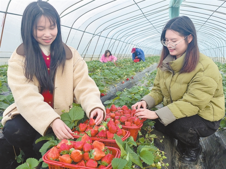 12月19日,在丰城市杜市镇南溪村乡贤投资的温室大棚草莓基地,游客正在采摘草莓。近年来,杜市镇探索“乡贤+产业”发展模式,激活乡贤资源,发展特色产业。通讯员 邓迎华摄