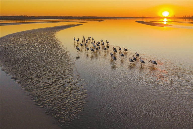 图②:12月21日,黄河山东高青段,国家一级保护野生动物东方白鹳在夕阳下的浅滩上漫步(无人机照片)。