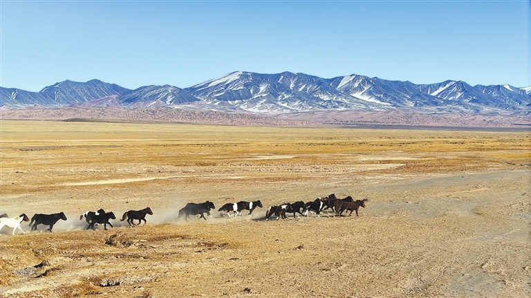 图③:12月21日,马群在甘肃省酒泉市阿克塞哈萨克族自治县境内的哈尔腾高原上驰骋(无人机照片)。