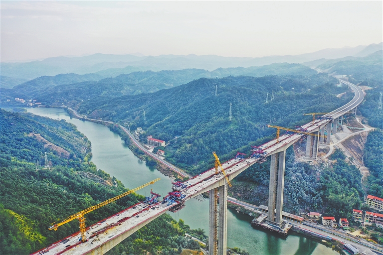 12月21日,遂(川)大(余)高速上犹江特大桥项目现场,工人正进行桥面施工建设。遂大高速是我省高速公路规划网“10纵10横21联”中第9纵的重要一段,目前整体工程进入全力冲刺阶段。本报全媒体记者 徐 铮摄