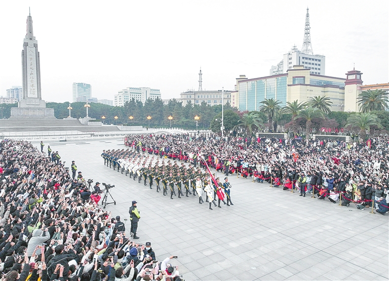 1月1日,南昌市在八一广场举行“弘扬爱国志 奋进新征程”元旦升旗仪式。现场人山人海,气氛热烈,市民、游客一同高唱国歌,祝福祖国。本报全媒体记者 史港泽摄
