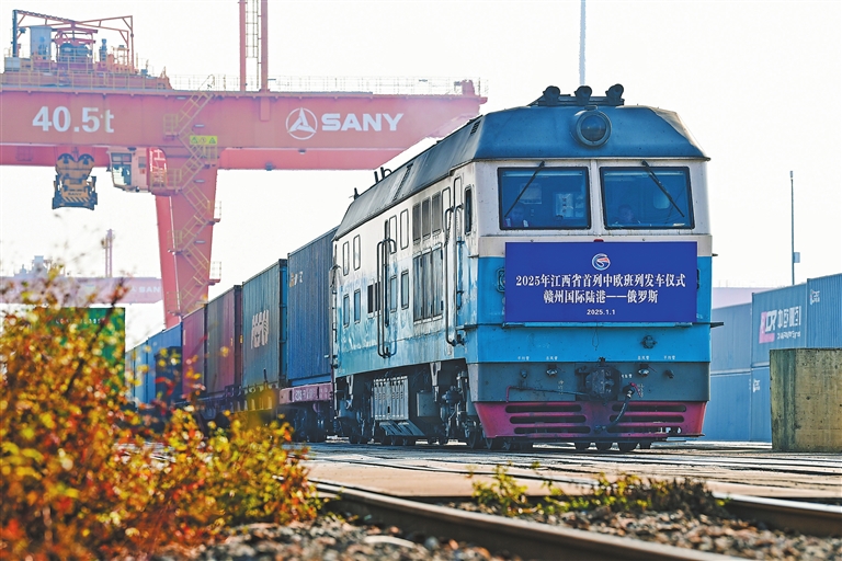1月1日,赣州国际陆港一列满载家具、服装和百货等货物的班列,缓缓驶出陆港,前往俄罗斯。据悉,这是今年江西省首列发车的中欧班列。