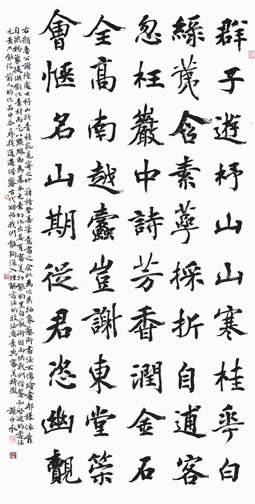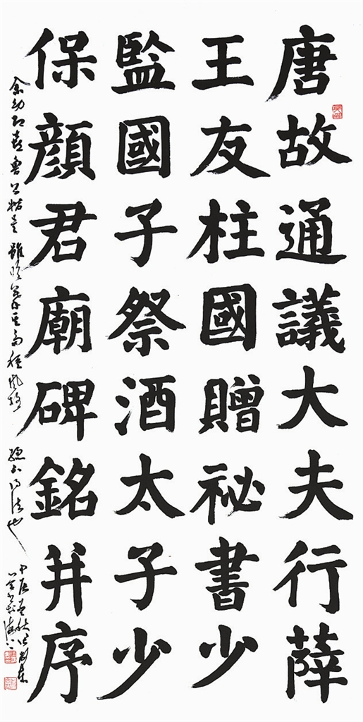 本次展览作品,每位作者临、创作品各一件。临帖作品以唐楷特别是以颜楷为主,创作作品以临帖风格为基准,同时考察书家们的临古能力和创作水平,体现了“变”与“不变”、继承与发展、原则性与创造性的辩证统一。