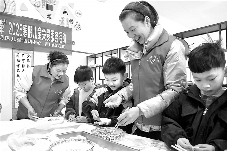 1月21日,在萍乡市安源区青山镇新时代文明实践所,孩子们在志愿者陪伴下体验民俗文化,学习生活技能。