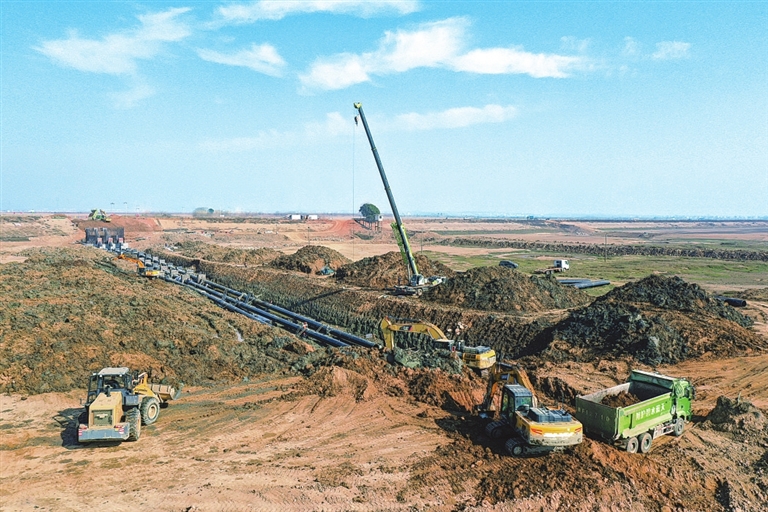 1月20日,余干县瑞洪镇六0灌区提水泵站及灌渠提升改造工程现场一片忙碌景象,工人们抢抓晴好天气加紧施工。