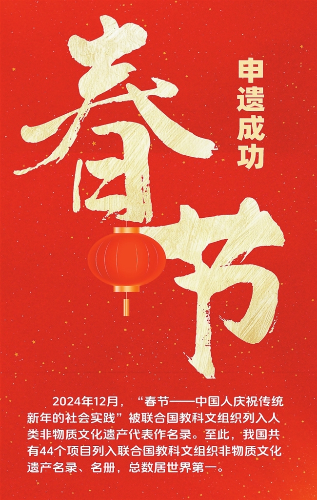 乙巳蛇年春节的脚步越来越近了,亿万中国人民沉浸在迎接新年的喜悦中。近日,“春节——中国人庆祝传统新年的社会实践”成功列入联合国教科文组织人类非物质文化遗产代表作名录,进一步彰显了春节所蕴含的全球价值。春节属于中国,也属于世界,以春节为重要载体的中华文化是人类文明的奇迹,也是我们自信的底气。
