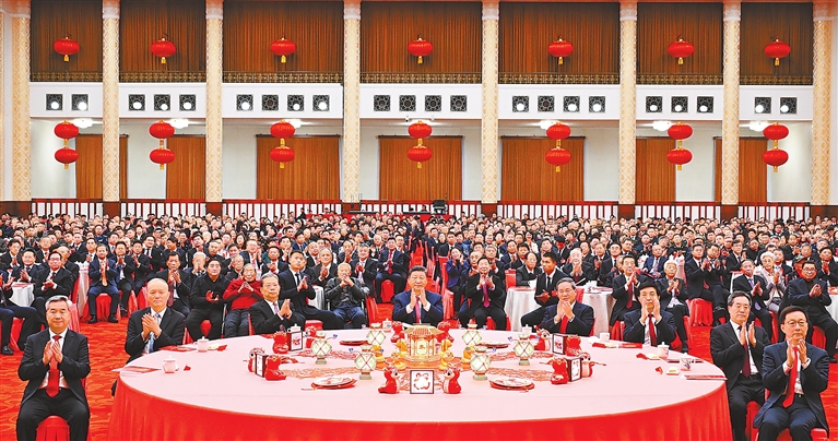 人民大会堂宴会厅灯光璀璨、暖意融融,各界人士2000多人欢聚一堂、共迎佳节,现场洋溢着欢乐祥和的节日气氛。