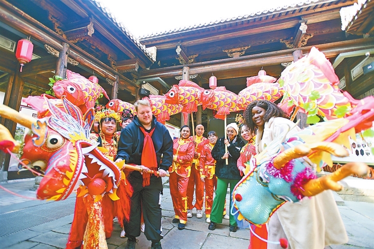 | 1月16日,在万载县新时代文明实践中心,江西师范大学的外国留学生正在学习彩带龙、鱼龙灯彩民俗表演,感受中国传统文化的魅力。 特约通讯员 邓龙华摄 |